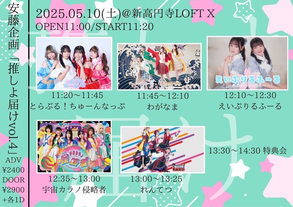 ライブ SCHEDULE 2025/05/10(土) 高円寺LOFTX 『推しよ届けvol.4』 📍 新高円寺LOFT X 🎤12:10-12:30 📢13:30-14:30(終演後物販) 🎫:tiget.net/events/398612 URLをコピーする 報告する