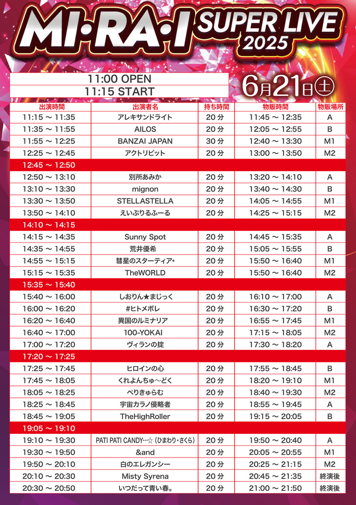 ライブ SCHEDULE 2025/06/21(土) 渋谷近未来会館 🌸6/21(土)ライブ情報🌸 「MI・RA・I SUPER LIVE 2025」 📍 渋谷近未来会館 🎤13:50-14:10 📢14:25-15:15(M2) 🎫:tiget.net/events/408076 えいぷる入場1Pt🌷 #えいぷる #えいぷるLIVE URLをコピーする 報告する