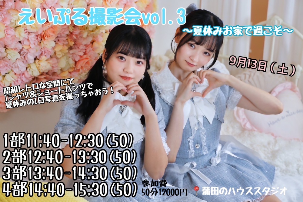 えいぷる撮影会vol.3 SCHEDULE 2025/09/13(土) 🩵えいぷる撮影会🤍 9/13(土)蒲田のハウススタジオにて えいぷる撮影会vol.3を開催します! 今回は夏休みお家で過ごす時のTシャツ&短パンコーデです🫶🏻️ えいぷる休日見にこない??? 予約フォーム URLをコピーする 報告する