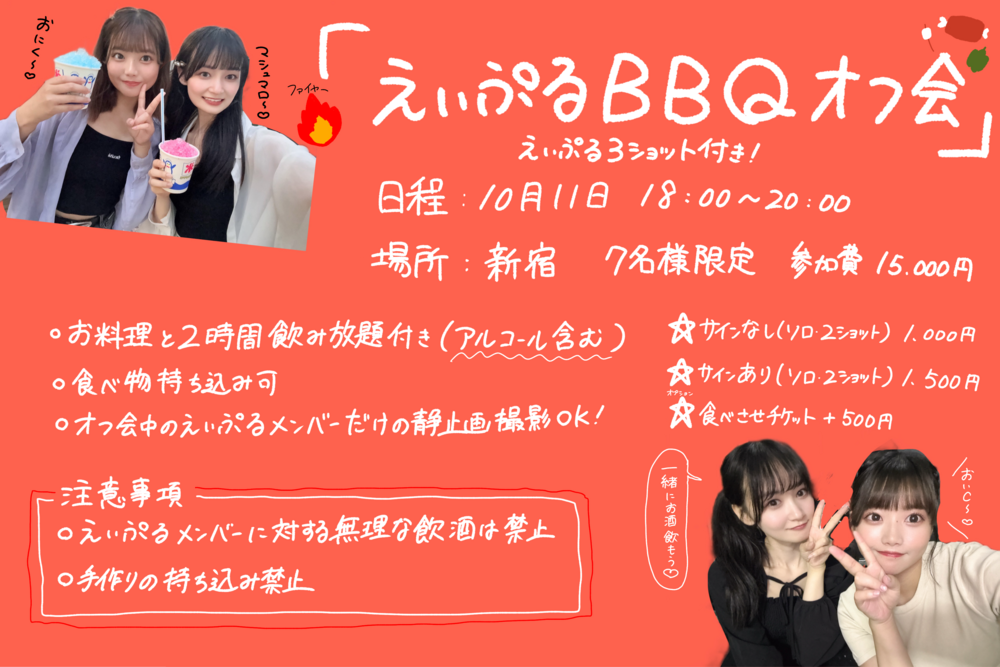 えいぷるBBQオフ会 SCHEDULE 2025/10/11(土) 新宿周辺 🌸お知らせ🌸 『えいぷるBBQオフ会』 開催日:10月11日 (土) 時間:18:00~20:00 📍新宿 7名様限定 参加費15000円 夏の最後の思い出みんなで作ろう✨️ えいぷるもすごく楽しみなのでみんな予約待ってるよ🥰 予約開始 9月20日(土)15時- #えいぷる #えいぷるオフ会 チケット URLをコピーする 報告する